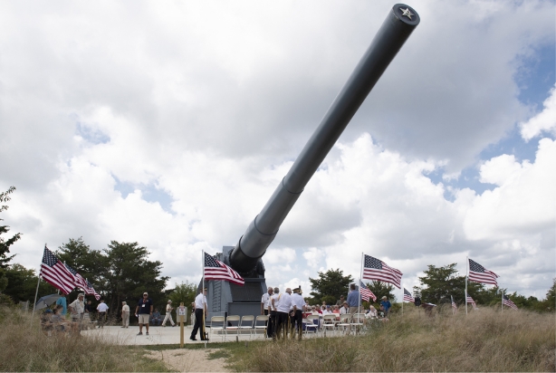 In May 2016, using two immense cranes, 80 tons of counter weights, riggers and dozens of volunteers, the 16-inch gun was assembled at its permanent location in Fort Miles Artillery Park, overlooking the Atlantic Ocean.