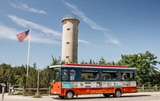 The first stop was Fire Control Tower No. 23 museum for a private tour. Visitors can climb a spiral staircase to the top to see restored fire control stations with WWII period equipment. FMHA members enjoyed comparing this tower with Delaware’s FC Tower 3 and FC Tower 7 that have been restored and are open to the public. FC Tower 23 included assignments for Battery Hunter, Battery 519 and Battery Smith at Fort Miles. The next stop was Cape May State Park to see Battery 223 (two 6-inch shielded guns). Erosion has left this battery structure on the beach, and it normally is sealed. A few energetic FMHA members, however, visited the structure’s interior. Enroute to the trolley, several FMHA members were brave enough to climb the Cape May Lighthouse for an excellent view. The trolley took us to the center of town to look at Fire Control Tower 24 from the outside because the Grand Hotel’s buildings surround the concrete tower, and its access is controlled by the hotel.