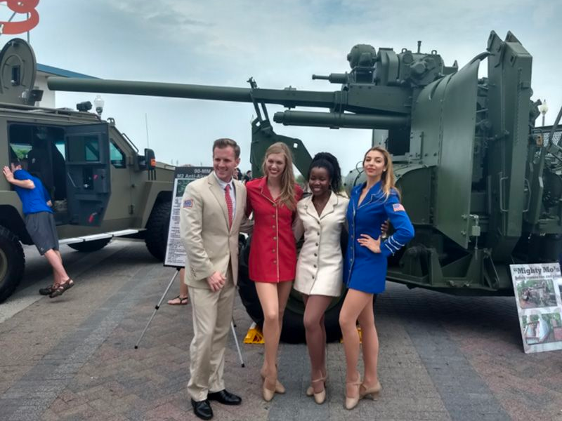 USO Club representatives decked in Red, White and Blue posed in front of the 90mm Gun.