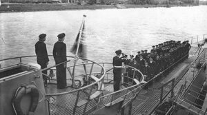 Unknown to U 853, a recent convoy had just arrived in American waters and its three antisubmarine warfare (asw) escorts were immediately ordered to find the escaping U boat and attack it. DD Ericcson, DE Atherton and PF (Patrol Frigate) Moberly immediately took up the hunt for U 853. Seven miles east of Block Island, R.I., the American hunter-killers found the U 853 and the attack began the night of May 5, 1945. Joined by two blimps from Lakehurst, N.J. (K-16 and K-58) with their 7.2-inch rocket bombs, the American force unleashed a withering attack on the submerged boat. After raining down 264 Hedgehogs, 195 depth charges and six rocket bombs from the two blimps, the U 853 was finally destroyed May 6, 1945, and became the final resting tomb in 121 feet of water for its crew of 55.